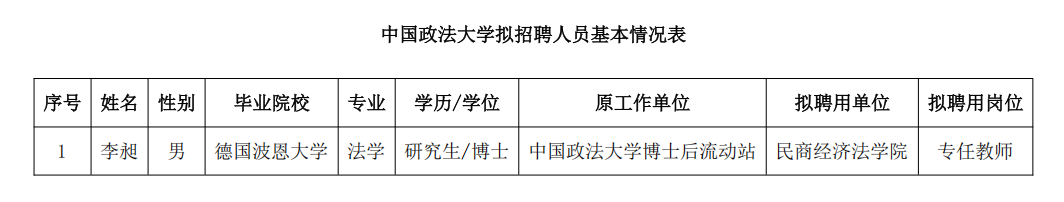 根据《中国政法大学公开招聘事业编制人员的规定》,拟招聘下列人员来校工作,现予以公示。公示期为7个工作日,自2025年11月18日至2025年11月26日。
